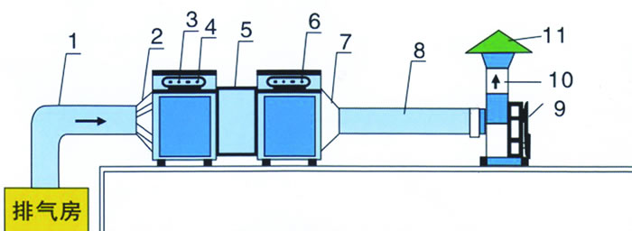 1、排气管 2、导风分流管 3、电控工作指示 4、等离子一级净化器 5、串联风管 6、等离子二级净化器 7、变径管 8、排气管 9、风机减速振套 10、离心抽风机 11、排风管 12、雨帽