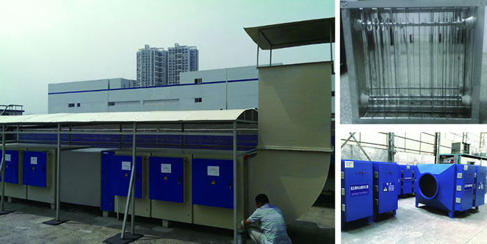 采用脉冲高压高频等离子体电源和齿板放电装置,使其产生高强度、高浓度、高电能的活性自由基,在毫秒级的时间内,瞬间对有害废气分子进行氧化还原反应,将废气中的大部分污染物降解成二氧化碳和水及易处理的物质。