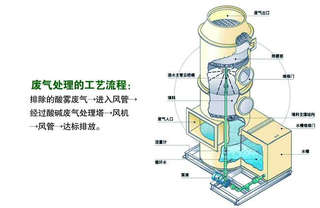 我司的酸碱废气处理(喷淋塔)主要的运作方式是不断酸雾废气由风管引入净化塔,经过填料层,废气与氢氧化钠吸收液进行气液两相充分接触吸收中和反应,酸雾废气经过净化后,再经除雾板脱水除雾后由风机排入大气。吸收液在塔底经水泵增压后在塔顶喷淋而下,**回流至塔底循环使用。净化后的酸雾废气达到地方排放标准要求,并低于**排放标准。