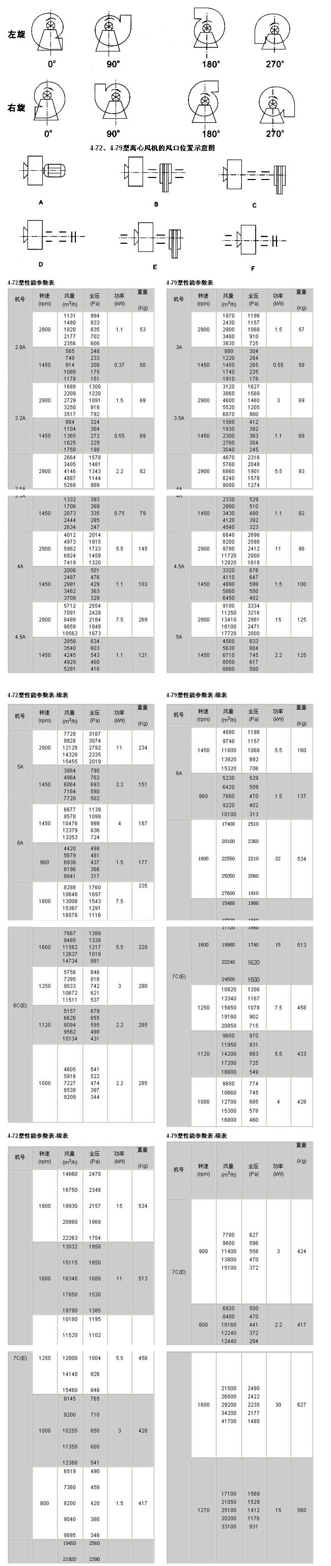 风机分左旋和右旋两种型式,从电机(皮带轮)侧正视,叶轮按顺时针方向旋转为右旋,逆时针旋转为左旋。A式为电机直联传动, B、C、E式为皮带传动,D、F式为联轴器传动。