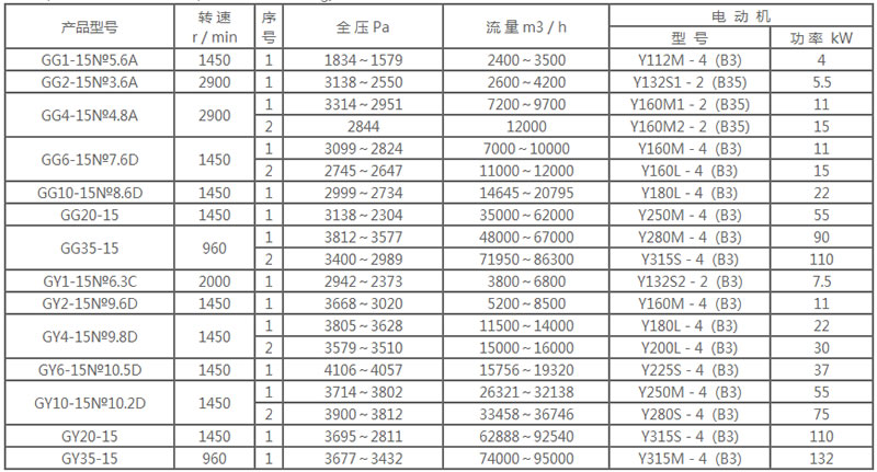 GG1-15~GG35-15通风机及GY1-15~GY35-15引风机是1t/h~35t/h工业锅炉配套的专用通引风机。随着"三废"治理的进一步提高,对锅炉排尘和锅炉热效率也有更高的要求,因此,对锅炉配用的风机有了更高的要求。经实地考察和锅炉运行需要,本公司推出了高压系列的1t/h~35t/h锅炉配套风机,以代替过去的1t/h~35t/h锅炉配套风机。