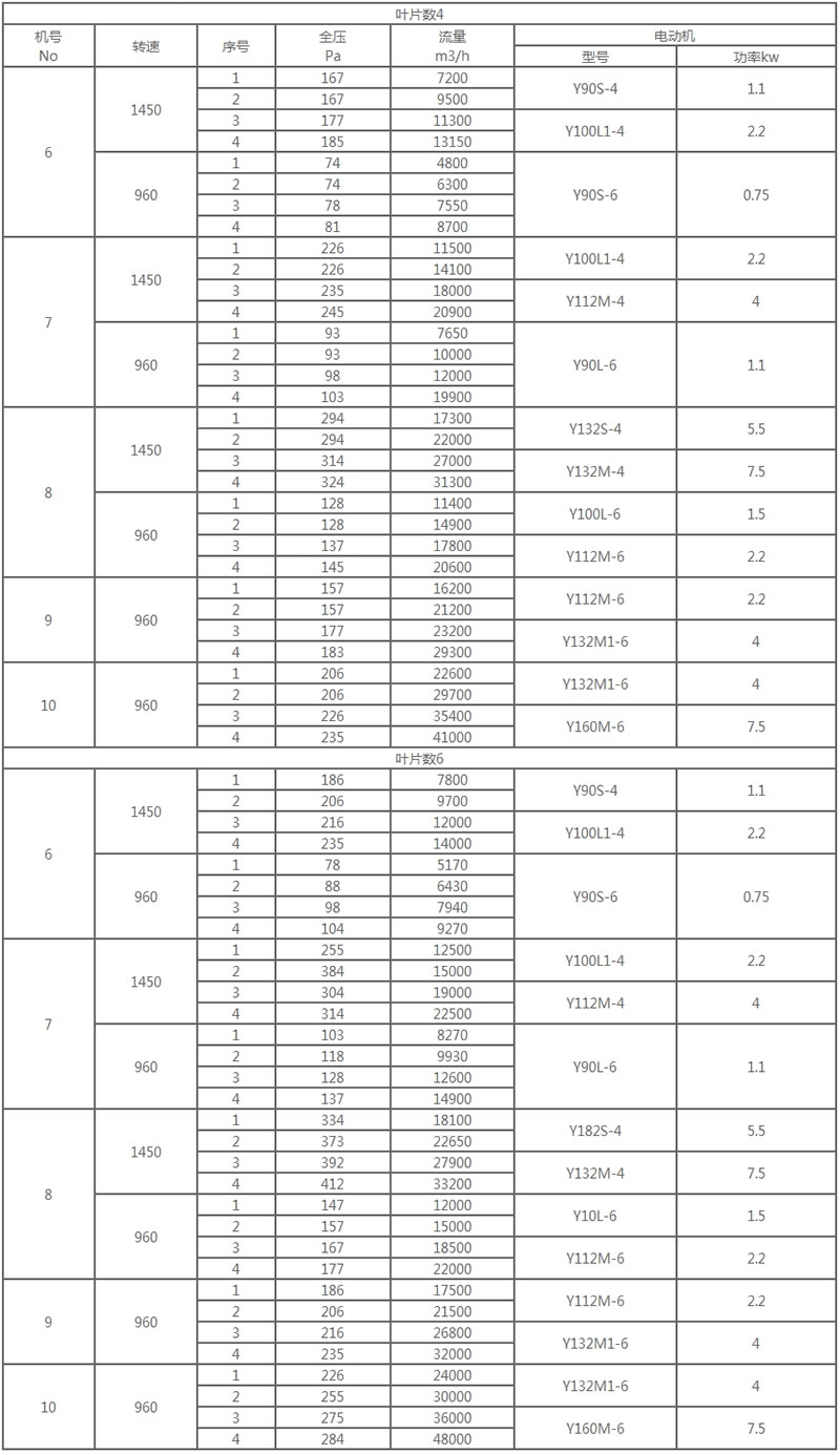 本风机按其叶轮直径共分NO4,5,6,7,8,9,10,11.2.等八个机号,叶片数有4片,6 片两种叶片安装角度可制成 15度,20度,25度,30度 四种。