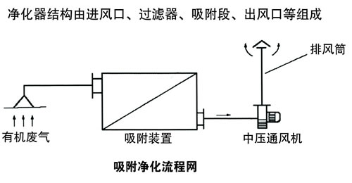 有机废气从进风口进入箱体后,先经过滤器滤除颗粒物,然后进入吸附段,经吸附段吸附净化,净化后的空气由通风机排入大气,饱和后的炭纤维取出再生,再生后的过滤筒装好后仍可继续使用。